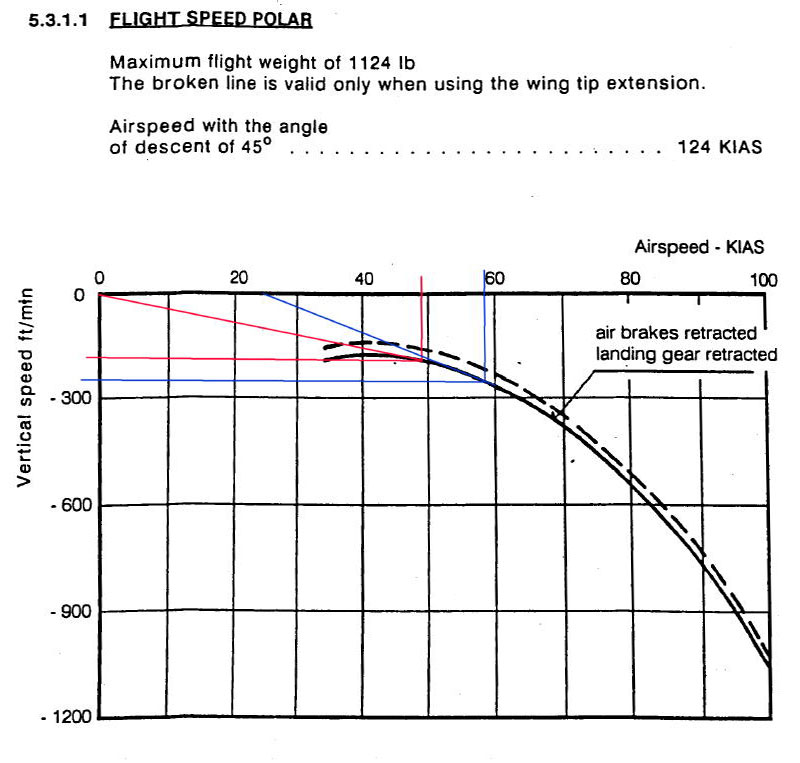 An L23 at maximum gross weight has a published best L/D of 29:1 at 48 kts (the polar below [red lines] agrees :-) ). The task is to fly from point A to point B and the distance between A and B is 1 nautical mile (nm). So, let's see what it takes to fly the task in various wind conditions. Note that we're ignoring sink and concentrating only on the effect of a headwind. We want to consider 3 scenarios for the task: the first, no wind; the second, a 48 knot head wind; and last, a 24 knot head wind.
