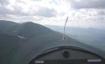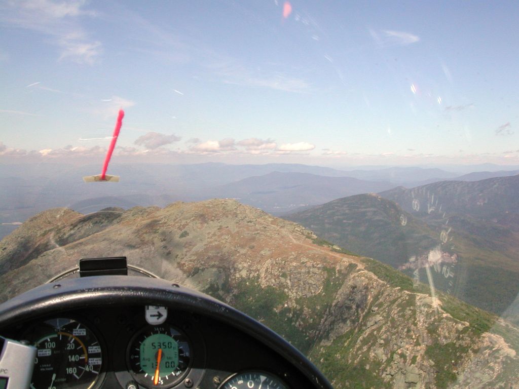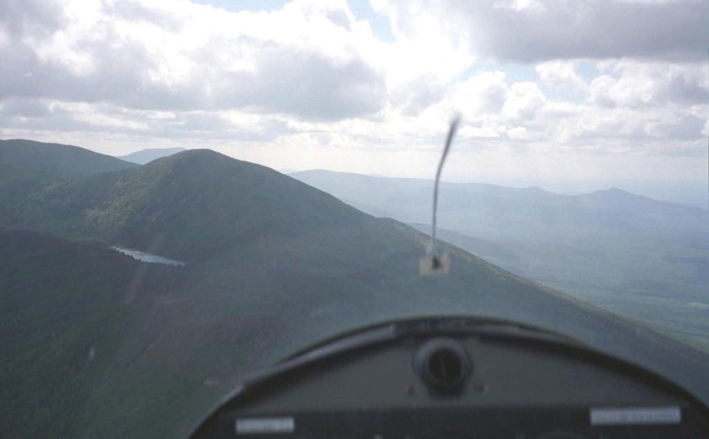 Ridge soaring Mt Lafayette. Wind, hitting the mountain (from the right [west]) is deflected up because it has nowhere else to go. The rising air keeps the glider aloft. |