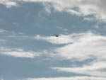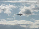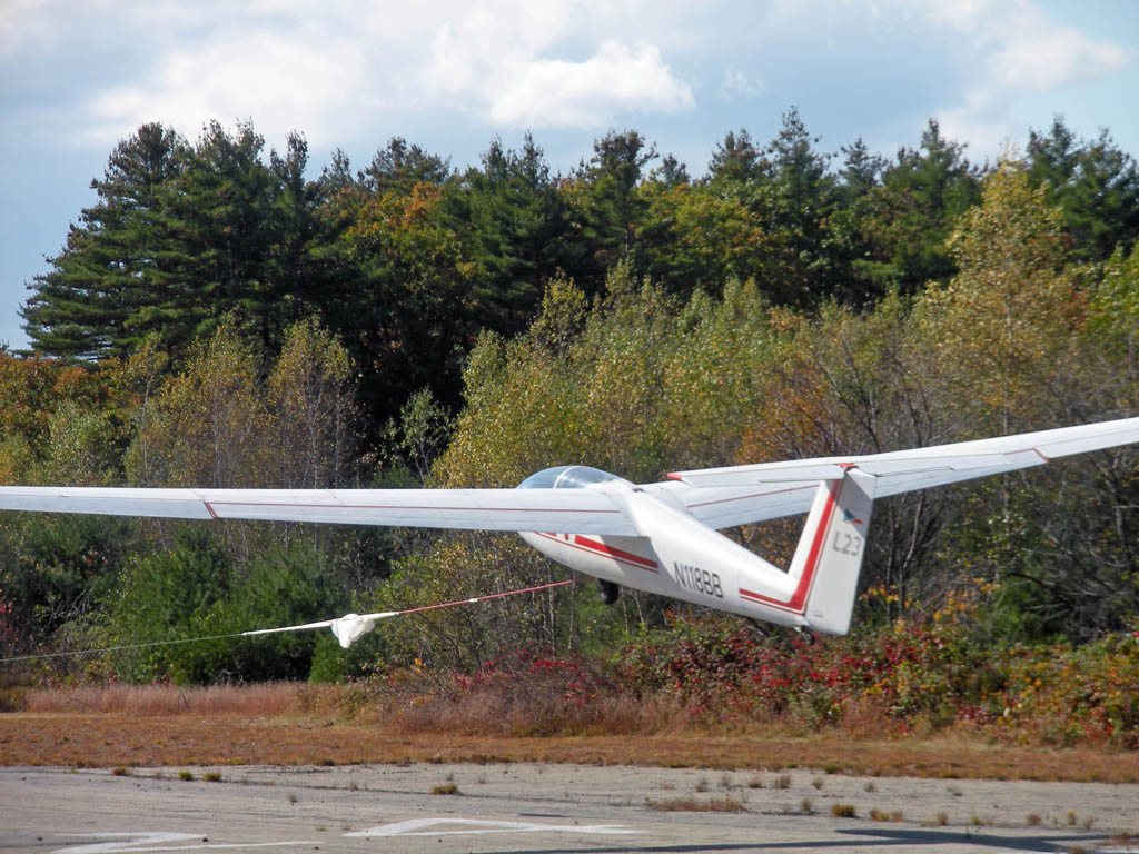 Here is a launch shown from the other end of the field. Note that the cable is attached close to the glider's center of gravity. This is important because in the climb, the glider is pitched up 45 degrees. If the cable is attached to the nose, it's impossible to pitch up enough. It's a real rocket shot. Here's a youtube video of one of our early launches. |